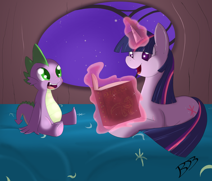 Twilight Sparkle and Spike read through a book from their foalhood, decided to draw spike PRE-WING as I am still catching up with season 8 XD