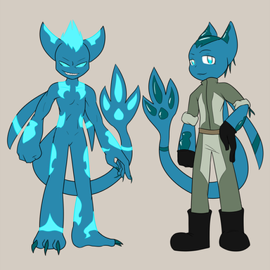 Sash's form is more of a mix between insect and feline with more leaning on the later. His main insect features involve a sort of combo eyes allowing him to not only see in the dark but also detect movement with perfect clarity. His body is extremely fluid able to move at remarkably smooth motions. He also has quite a surprisingly amount of strength though mostly focused around the thighs and wrists resulting in amazingly agile speed even if his punch is actually quite frail. His insect appendages are actually quite durable with razor sharp pointed ends but due to their smaller size and his inexperienced in their use they tend to spend almost all their time wrapped around his shoulders like a pair of backpack straps. How old he actually is may still be a mystery since even his basic backstory is really just his word, though he does seems to show signs of understanding modern concepts.