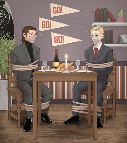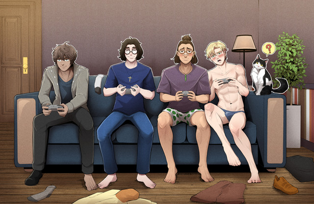 In this issue, Alan and Scott's New Year's Party arouses much interest, both from their close circle of friends (left to right: Alexis, Opal, Barlow, Trey, and Rye), and, well, Alan. 😜 Many thanks to my frequent art-ner in crime, Twitter's @Audenarylove for bringing this belated holiday vision to life. ❤Uncensored version is over on my Twitter account: