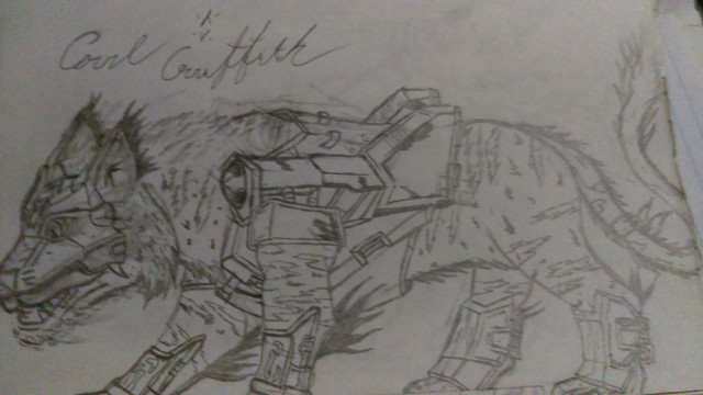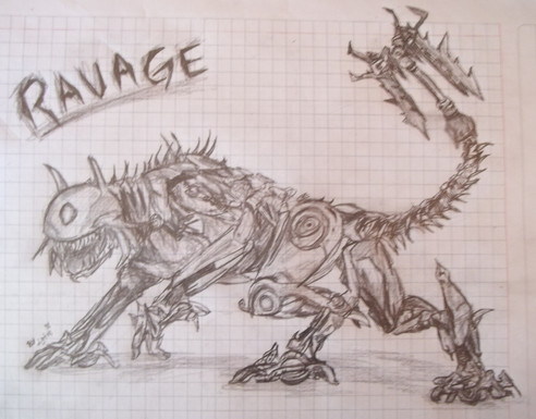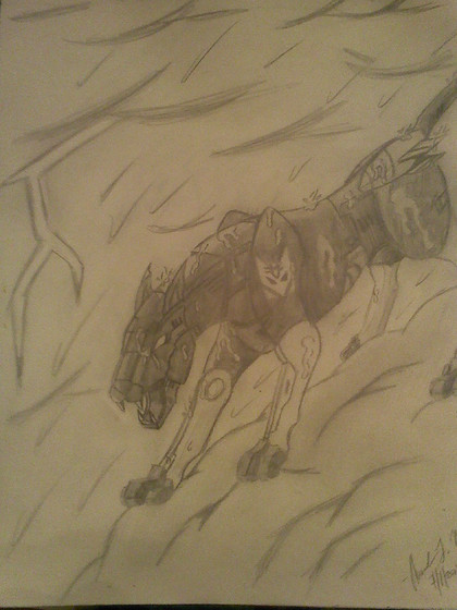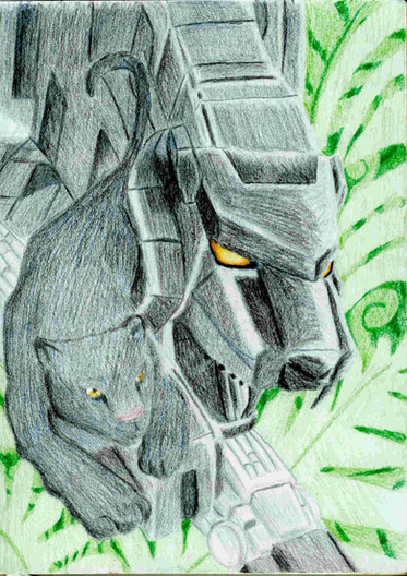 A reworking of an earlier drawing, with scenery added in. This is Ravage from Transformers in street art style art in colored pencils. I drew him while listening to Meteora by Linkin Park.Yes, it says "Glit was here" in the background, a reference to another Decepticon from the series.