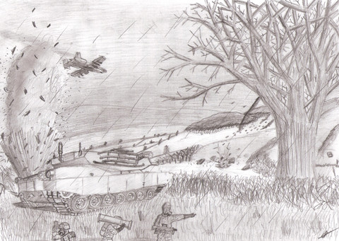 For one thing this looks pretty cool. Canucks ftw! But it seems rather flat because of the monotonous shade you put in in the entire pic. Perhaps you could have darken the VBCI( i think) or darken the background so as to emphasize the distance.