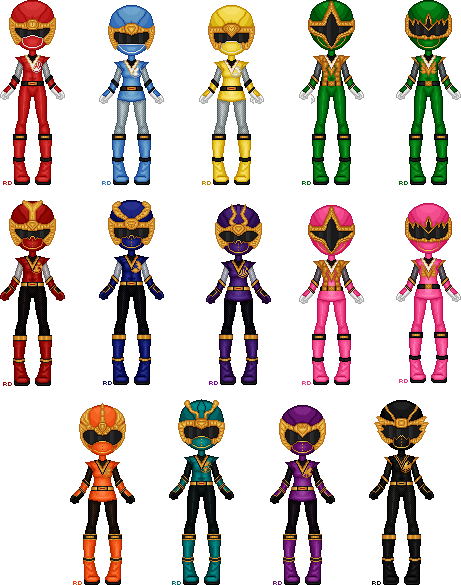 I had to update the girl's suit bases to the newest one...and ended up working on the upper body portions of both of them...almost completely reshading the boots, changing the way the girls' fit altogether....developing new and unique palettes for Red, Pink, Blue, Yellow, Green, and yes, even Gold. Reshaded the visors of the helmets, almost reshaded all the helmets themselves....and so eight hours later (actually it was closer to twelve, but I didn't pixel that entire time) brand new spiffed up PRSC Rangers!