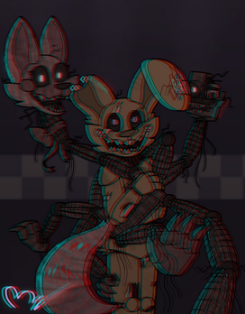 Woww 5 hours spent on a FNaF drawing :0I thought it would be really cool to start doing 3D art since I just found some of those special glasses, my program can't edit the colors of the whole layer so I had to color the red and cyan parts manually which kinda sucked and it doesn't look the way I wanted it to. :,)