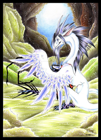 Raxxie!!! This is amazing! The way the colors work together so smoothly and yet in paint-like blotches, the anatomy of the wings and the intertwining tails, the detail of the runes beneath the webbings and the fuzzy white fur (that's shaded brilliantly also)--everything looks stunning!