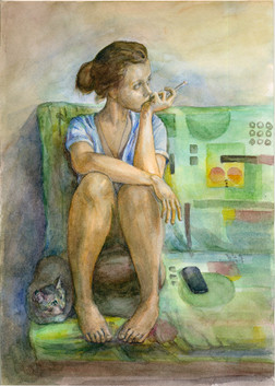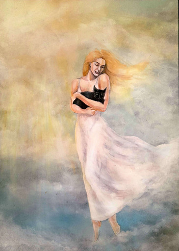 I like the texture in the backround and the cat and the woman (she looks kinda sad) but anyway great job with the painting and such. It takes a talented person to paint.