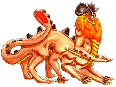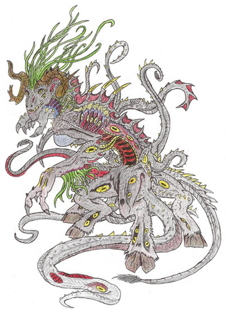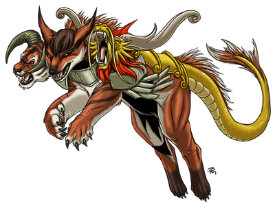 Very nice. Incredibly fierce looking. There's a light amount of chaos in the design of this creature with the two heads and the color scheme, but it works to the design's advantage and just looks very nice.