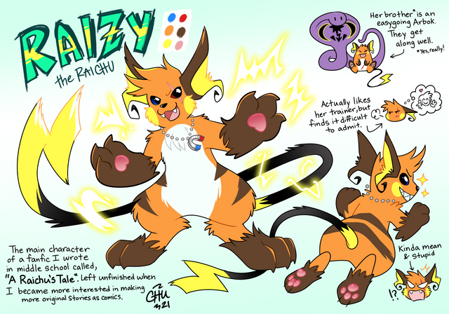 Ray was born in a forest till he was captured by scientists who experimented on him. His fur was changed into bright yellow and cyan. He managed to escape and lived in a city since. His fur has changed back to it's original natural color over the years, except for the cyan.