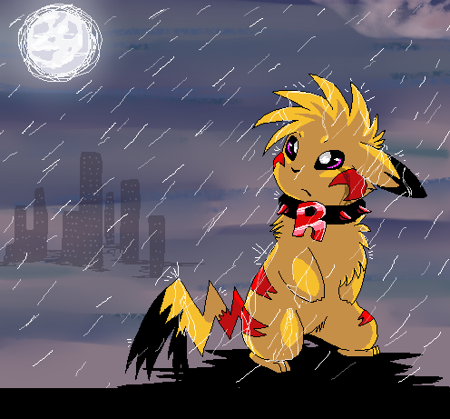 Oldest: He is an evil mischievous Pikachu, he is tainted by Team Rocket experiments who turned his red cheeks blue and gave him powers to transform into powerful forms with different items. He rarely works with Team Rocket now after he escaped but he still carries his evil habits and often steals/causes trouble wherever he goes.
