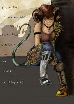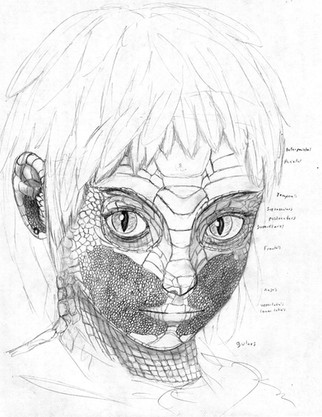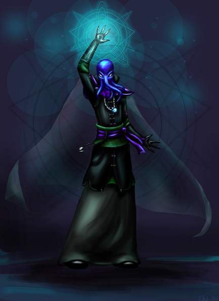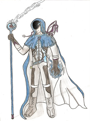 Something I pounded out pretty quick for a Mutants & Masterminds game; a fortune teller and con artist with some illusion spells in a D&D fantasy type world.She's from a group of humans who set up shop near the plane of shadow and started to unravel; they adopted the use of summoning circles and binding materials in their clothing and with tattoos in order to prevent themselves from becoming formless and fading into the plane (which tends to happen in the setting). Her eyes are glowy because she's wearing a veil literally made out of shadows, sort of a magical set of sunglasses, and she's got good nightvision, so the "glow" is just a reflection of daylight.