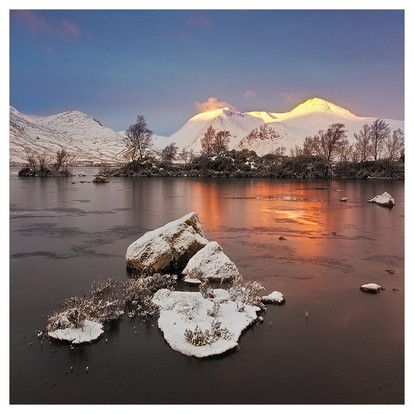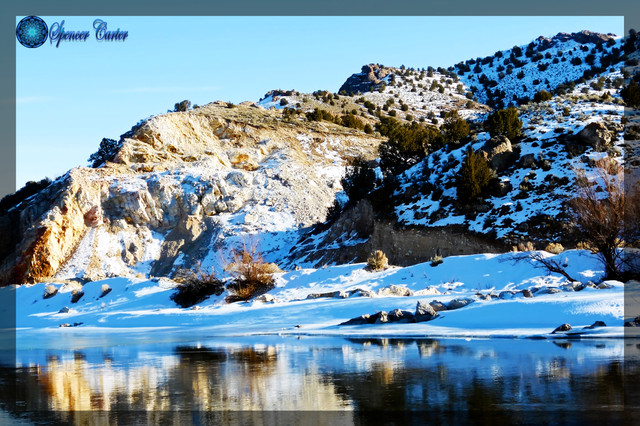 The orange in the few trees and the line breaking the bank and the snow gives it great depth.