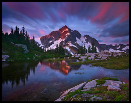 When I first moved to Washington, I saw images of Prusik Peak pop up in magazines here and there, and thought "I MUST GO HERE!" After doing some research I soon found that getting here wasn't a quick walk in the woods. Prusik Peak is one of the Enchantment Peaks located in the Alpine Lake Wilderness Area in Washington. The hike through the Enchantment Lakes basin is 18 miles long, gaining no less than 6,000 vertical feet. Though this hike was one of the hardest that I have done, I was also rewarded with some of the most gorgeous scenery I have ever seen. Prusik Peak is just one icon of an area with endless beauty; countless mountain lakes and tarns, huge glacial valleys, craggy peaks, and larch trees, which turn electric yellow during the fall. For me, experiencing the Enchantments satisfies a major goal of mine.Prusik Peak and the Temple from Gnome Tarn - Alpine Lakes Wilderness Area, Washington