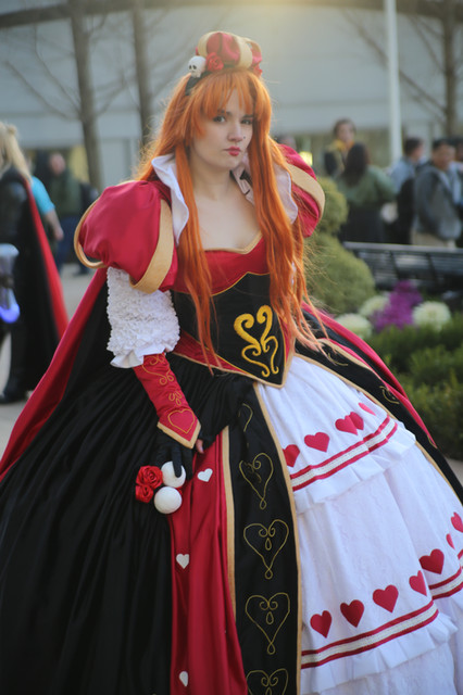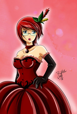 Outfit 1: She has a black and red corset, with a black and red tutu reaching her ankles to accompany it. She also wears a tiny top hat. Her sleeve and leg tattoos are revealed. There's a skull tattoo on her shin. On the occasion, she likes to wear elbow-length gloves.