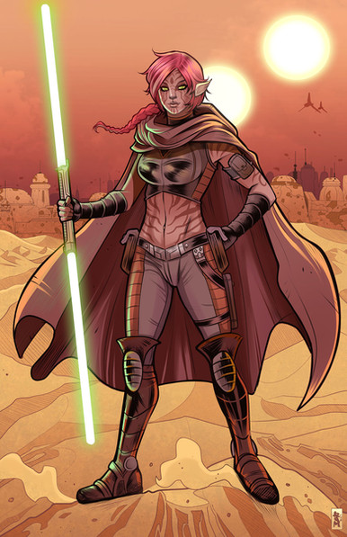 This is a lovely image of Aira-ty's change from a Jedi to Bounty Hunter. You've shown her flawless beauty with amazing skill, as always!