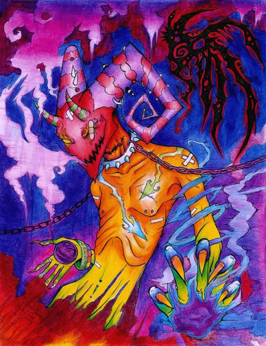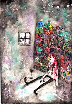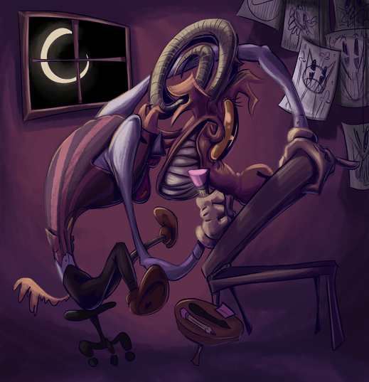That's an amazing piece! The colors and the details are all awesome. The chair looks pretyt cool because of how crooked it just seems to bend in this enviroment. Also, the weird patchy background with the red stripes and it adds to the red that appears next to the picture. It really seems somewhat chaotic all the while the piece he does seem alone. The greens next to the reds is a nice use of complimentary colors as well as the weird warm toned moon against the cool tones behind the killer plant. It's really great noticeing all the little things you added into this picture.