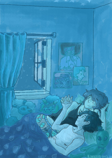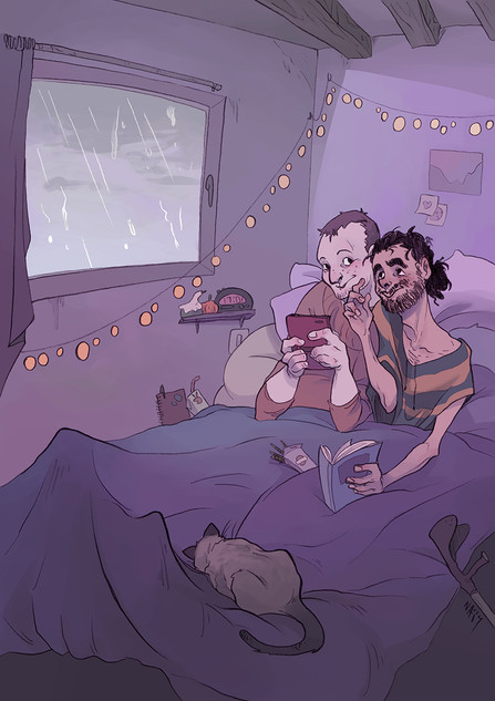 Sorry for being lazy with the colors ! But I chose to keep the grey effects I added on the first sketch, I found it nice...So Thran and Ahito are making some cat-sitting... read more in 's fanfict !