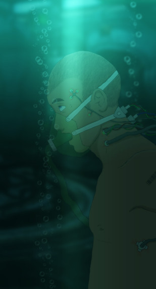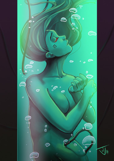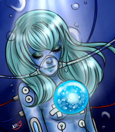 There are two versions of this you did in your gallery. If this is the completed one, I'm very happy about it, as you made many changes. The darkness beneath makes the healing stasis vat, if you call it that, all the more large. In general, the necessary wires are all present and nicely minimalist compared to what usually is too much wires and tubes. Her hair and position definitely give the feel of a relaxed form floating about in fluid. The injuries are very, how do you say, striking. I would have liked to see bubbles on the upper half of the picture as well.