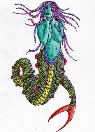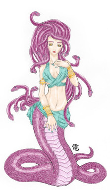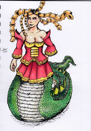 Melusine is the "eldest" of a set of half-faerie triplets. Her mother, Pressyne, married a king of Scotland on the condition that he never be in the room with her when she gave birth or bathed her children. He violated that covenant and she left and took the girls with her to Avalon. When she turned fifteen, Melusine asked about her father and why they were in Avalon and upon finding out, she and her sisters set out for revenge. They found their father and locked him up along with his riches inside a mountain. When Pressyne found out about it, she punished her daughters with a curse. The details of which regarding Melusine were that she would turn into a twin-tailed serpent from the waist down every Saturday.Melusine eventually married a human just as her mother did, but her covenant to him was that he never enter her chamber on a Saturday. When he inevitably did and saw her nagini form, she forgave him. But once when he called her "serpent" in front of his court in anger, she turned into a dragon and left him.