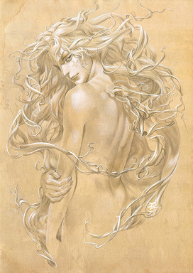 this is so beautiful... i see feathers in his hair.. like one or two.but its pretty just as it is ^^