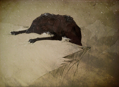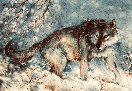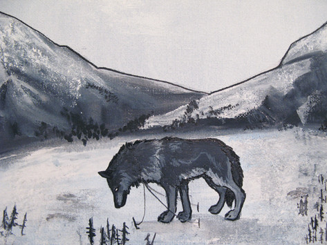 I'll say it again: I like this one better than the rest. Maybe it's the stark background or the way the coat of the wolf came out kind of ...fuzzy. Maybe the fewer colours give us a chance to really look at the wolf and not be distracted. He's looking at his shadow like he's wondering why it doesn't look right. Shouldn't it be taller? And four legs...why four. ...something is not right....