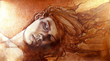 So, this is a digital print (I overprinted it about four times, actually), with metallic inks and acrylic paint and pigment pen and pastel and all manner of things worked on top of it.