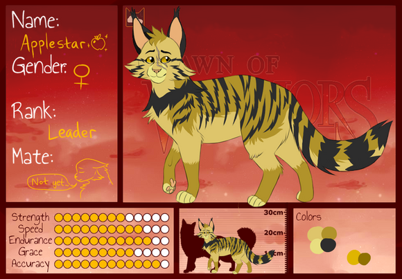 Updated as of August 2020.The large, imposing leader of StarClan. She is confidence and power incarnate, and she seems to have a paw in all matters of Clan ceremonies and trials. Applestar is not someone you want to take lightly.