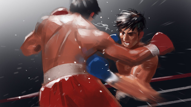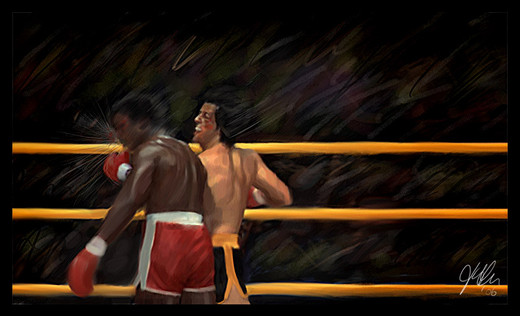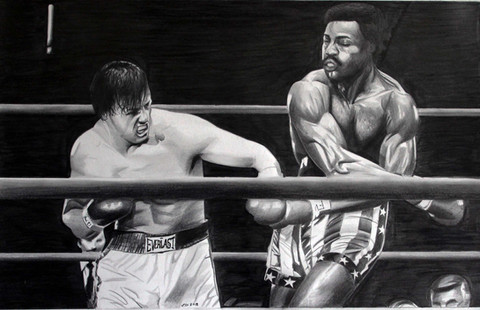 I lika all the little details, from the mouthguard in Rocky's mouth down the writing on Drago's shorts. And that the sweat and spittle are flying off each other. Very good work.