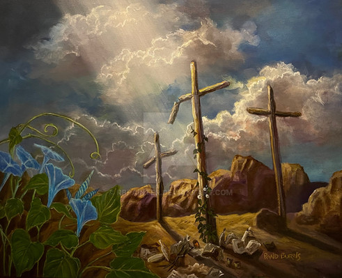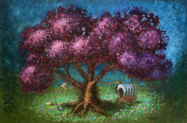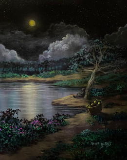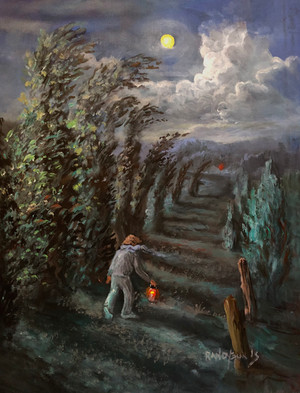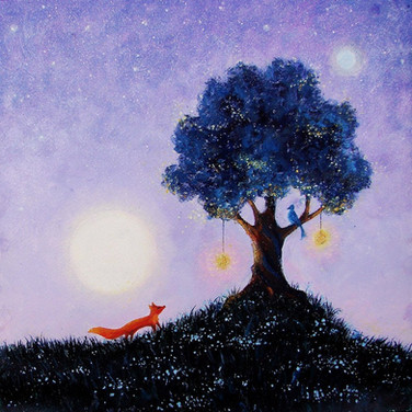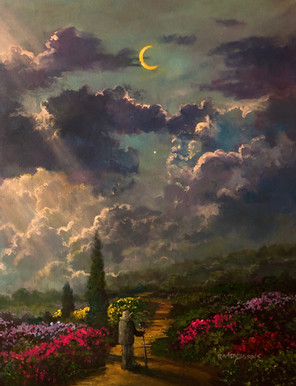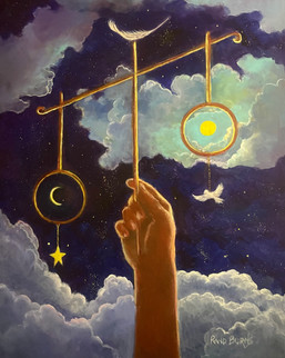 Precariously balanced on a unicycle, a wanderer carries his own stars when none appear in the sky. Hanging from strings and balanced on his shoulders, these stars and a crescent moon decorate the branches of a tree. The art of creativity is our closes bond to the Master who made it all. 24 x 20".Related content