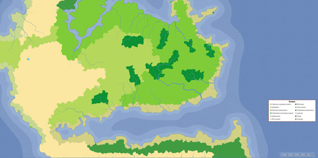 Zaberen is a continent split in two by a massive mountain chain. The continent is in the planet's southern hemisphere, so the western side of the continent is slightly colder than the east. Slightly; because there is a warm ocean current, from the sea that hits the south east side of the continent. And most of that ends up going up the western side of the mountains, into lake Jero. Thusly the western side of the continent has a pleasant, British style climate on the southern end. And a more Mediterranean style climate, to the north.On the eastern side of the mountains however; things are very different. The land is incredibly dry and sandy; and only the southeastern coast gets any consistent rainfall. Making a large chunk of the east a giant desert. The western half of the east however; has active volcanos, that make the soil a touch more fertile in tandem with the occasional rainfall. Even still; the land is made up almost entirely of drylands, that just barely get enough rainfall for small yearly harvests. The only part of the east that's actually good for agriculture however is the south east, which gets some of those warm ocean currents. And thus is able to support much larger agricultural societies.