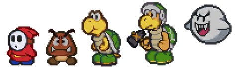 Uploading some older stuff yet again - some custom partners i came up with! The names on some of these aren't final.Little T. - It's the toad from the dojo in PM64! Now that he's grown up, he can punish enemies with his flying kicks and get information by tattling.