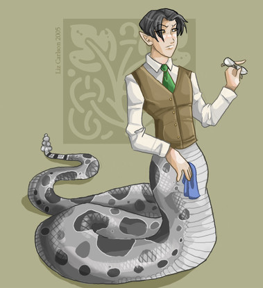 The smiling viper in a winged collar ~A businessman of some...shady practices, this silver-tongued naga employs (i.e. hypnotizes) Ricky to recover various curiosities. In return for the cursed fox's services, Ricky is given a shelter and some semblance of purpose. Copperhead's not really a bad guy though...sneaky, dishonest, manipulative, clingy, sure - but it's not like he has no heart.