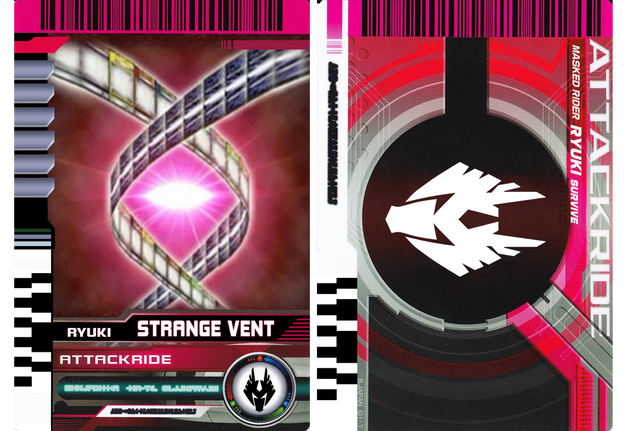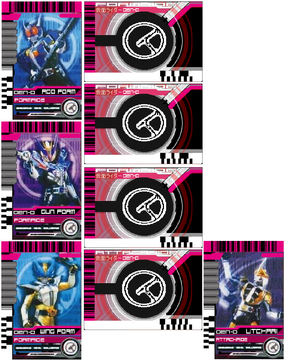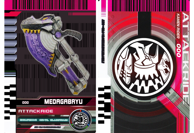 The Diendriver has similar functions to the Decadriver belt, but also functions as a firearm. To use a Rider Card, Diend pulls on the Fore End to open the gun. Diend then places a Rider Card inside the gun, loads it, and fires it. Daiki usually fires the gun above him, sometimes in front of him to hit the opponent, in order to transform and activate other Rider Cards. He can also load multiple Rider Cards one right after another, causing all of them to activate at once when the trigger is pulled.The other crucial difference to the Decadriver is that while Diend uses his personal Kamen Ride Rider Card to transform, he uses the Kamen Ride Cards to summon copies of past Kamen Riders rather than Decade who transforms into them. When selected Riders summoned, they would first appear as three separate holograms consist of three different colors, red, blue and green that scrambles until they combine and solidified. Diend also has his own Attack Ride and Final Attack Ride cards which can be used in the Diendriver. As well as that, Diend also possesses Final Form Ride cards with which he can transform certain Kamen Riders, whether they are summoned by him or the real thing, this is performed by loading the card and firing directly at its associated Rider.