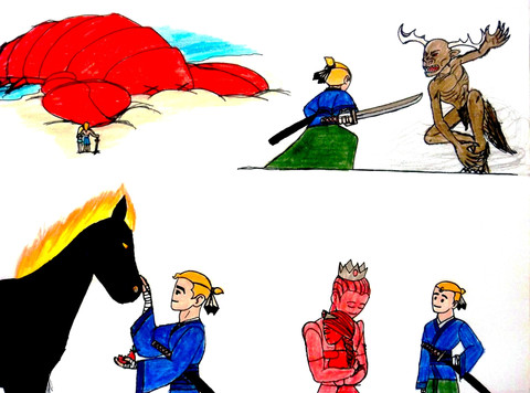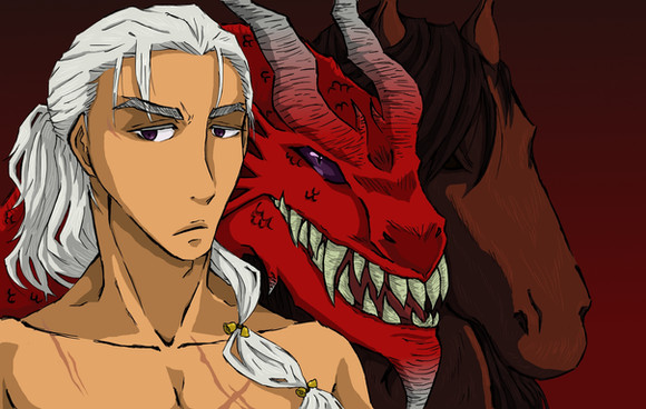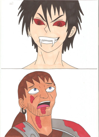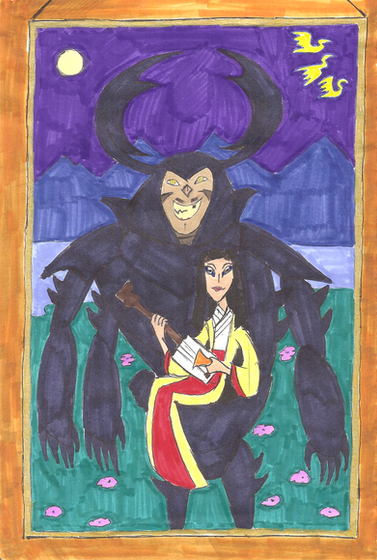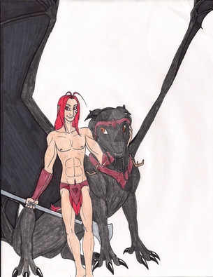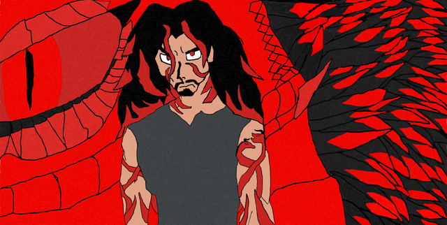 Commentary: I decided to add a red moon to fit in the with theme of a red moon beast. Drawing the tattoo on the Moon King's back was quite an interesting endeavor because one has to be aware of the contours along the spine and shoulder blades. Also, in keeping with him being a red dragon, I made the moon beast shades of red, orange, and silver, to invert his usual blue and gold colors.