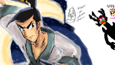 An intriguing scenario! Though I feel like Jack would be at a slight disadvantage if Karasu (sister with the claw weapon) ever got her hands on his sword. But I'm sure he'd get it back in no time. I like how this picture gets you thinking and calculating how the heroes would defeat the villains.