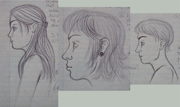 That's incredible! Three very different styles and yet they all look like you! Still experimenting with less-perfect circled lower jaws? I like the one on the left best, the slightly amazed look you drew in her eyes is wonderful.