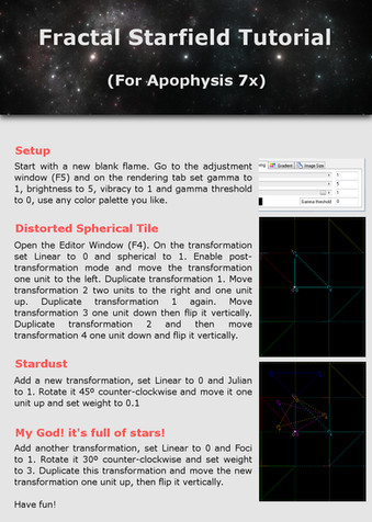 This is a tutorial on how to use Apophysis that I made for ~Baudelaire-nightmare , but it can be used by anyone if they choose to. If you use this tutorial to make any fractals in Apophysis, lemme see what you did!Sorry it took sooooo long, B-N.