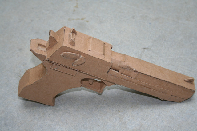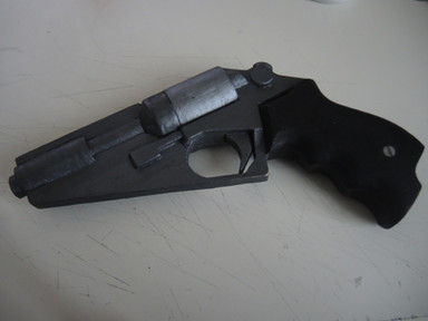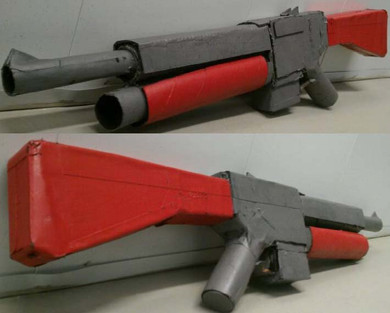 This is one of The Scout's weapons from Team Fortress 2, a quad-barrel "pepperbox" pistol which in-game behaves like a shotgun.This is largely a wooden prop, with a sanded grip and some cardboard bitz for detail. The barrels are paper towel tubing.