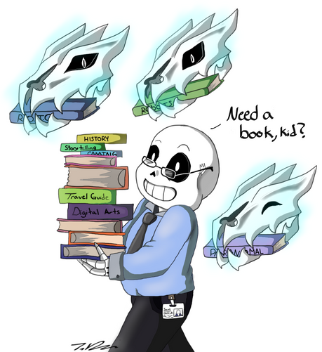 Really well done on the pose, you've nicely captured his personality. The way he is standing and holding the books, looks a bit... Clumsy. And the small mess with the sheets falling out. Yup, definitely typical for Sans, lol.Β