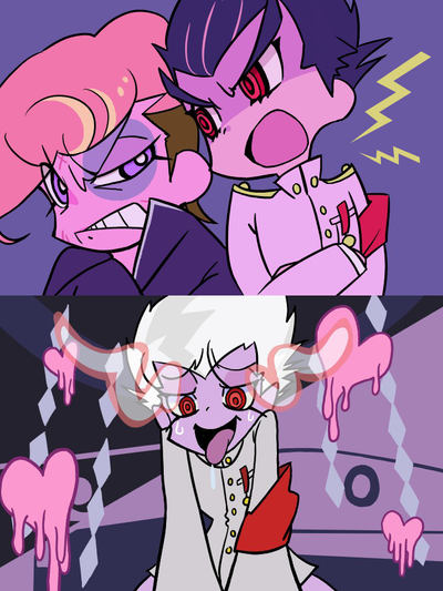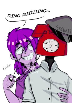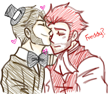 Can I just add that Purple guy is confirmed to be William Afton and Phone Guy confirmed to be Fritz Smith? Also that Fritz is a nightguard, while William is basically co-founder of the whole place? Plus, just because people like this artist draw things like this of these characters doesn't mean we don't appreciate FNaF for what it is. I've drawn a lot of fanart of these two, but I've played the games, read the book, followed every teaser for every new thing about the series. I just keep that side of FNaF separate to my fandom side. People can make what they want out of whatever they want. It doesn't mean they don't appreciate the canon side of things, or don't know anything about the series, it just means they want to make something new out of it.