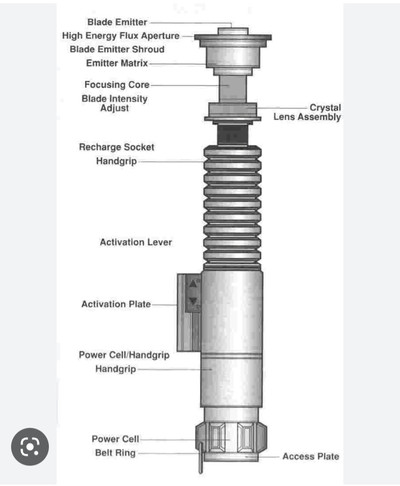 A custom lightsaber hilt, with an internal diagram and labels identifying the components.I have created a 3-dimensional render of this drawing in Blender. You can see it as a whole here: [link] , and disassembled here: [link]
