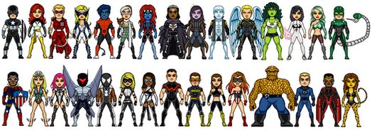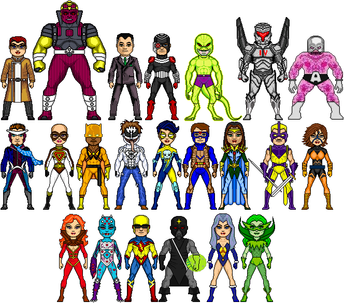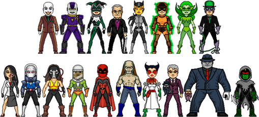 Sixth Row: Lex Luthor, Lightning, Livewire, Lobo, Madame Xanadu, Mammoth, The Manta, The Marvel, Mary Marvel, Maul, Mento.