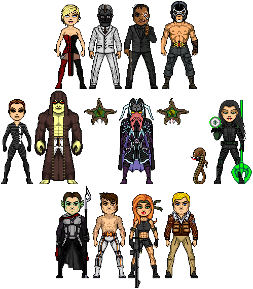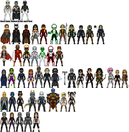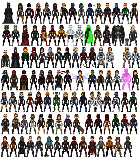 First Row: Aquaman, Aquazon, Aresenal, Artemis, The Atom, Aya, Bane, Barda, Batman, Beast Boy, Ben 10, Bizarro, Black Canary,