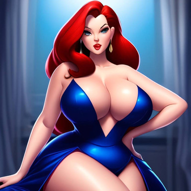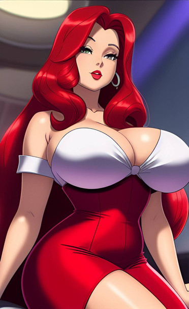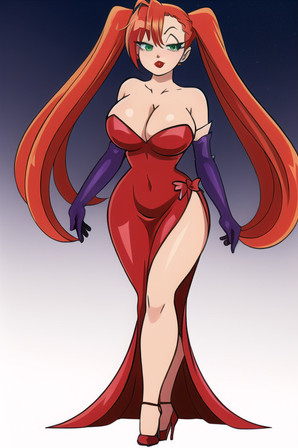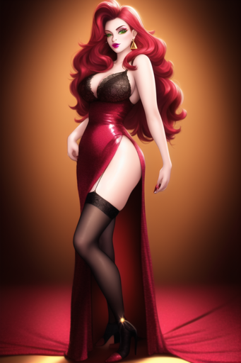 #cleavage #greeneyes #highheels #hugebreasts #jessicarabbit #longhair #orangehair #purpleeyeshadow #reddress #redlips #longhairgirl #straplessdress #widehips #wide_hips #elbowgloves #jessica_rabbit #thickthighs #haircoveringeye #huge_breasts #thick_thighs #orangehairgirl #narrowwaist #greeeneyedgirl #narrow_waist #novelai #novel_ai