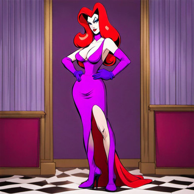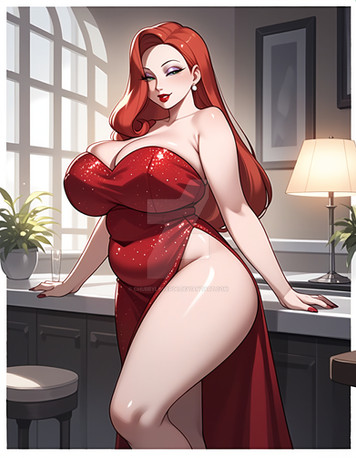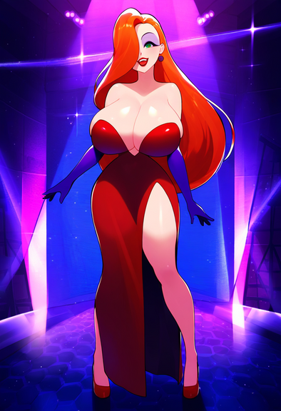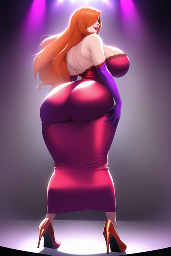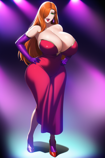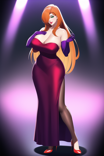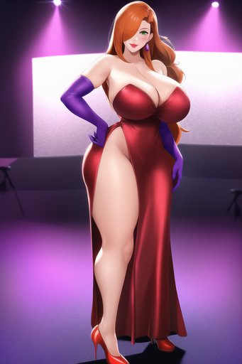 #cleavage #cocktaildress #greeneyes #highheels #hugebreasts #jessicarabbit #longhair #longhairedgirl #orangehair #orangehairedgirl #purpleeyeshadow #reddress #redlips #purplegloves #straplessdress #widehips #curvywoman #wide_hips #elbowgloves #jessica_rabbit #thickthighs #haircoveringeye #huge_breasts #thick_thighs #narrowwaist #greeeneyedgirl #narrow_waist #novelai #novel_ai