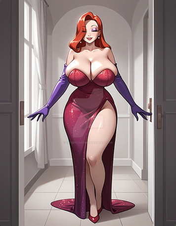 #cleavage #cocktaildress #greeneyes #highheels #hugebreasts #jessicarabbit #longhair #longhairedgirl #orangehair #orangehairedgirl #purpleeyeshadow #reddress #redlips #purplegloves #straplessdress #widehips #curvywoman #wide_hips #elbowgloves #jessica_rabbit #thickthighs #haircoveringeye #huge_breasts #thick_thighs #narrowwaist #greeeneyedgirl #narrow_waist #novelai #novel_ai