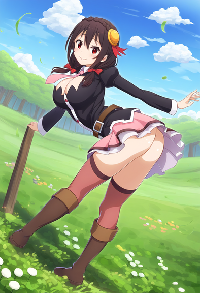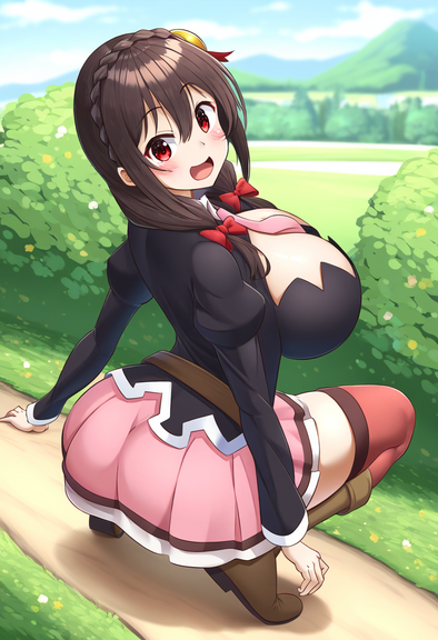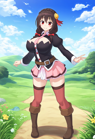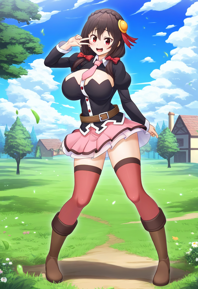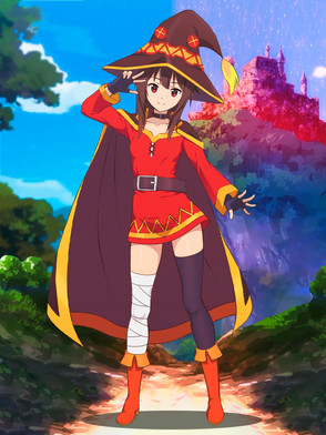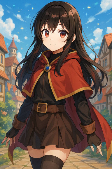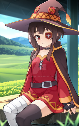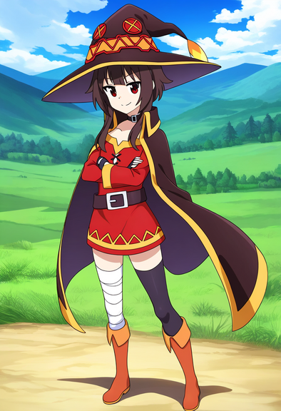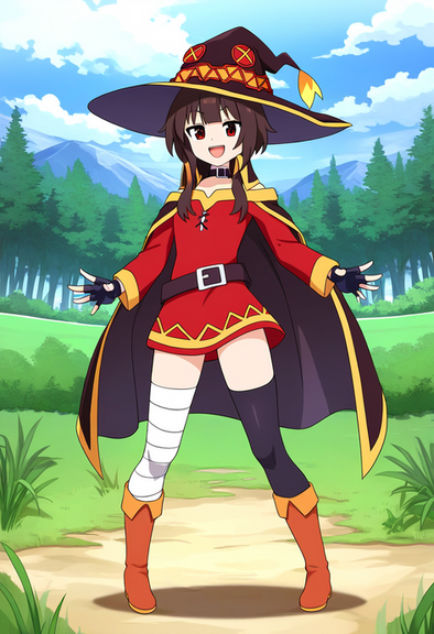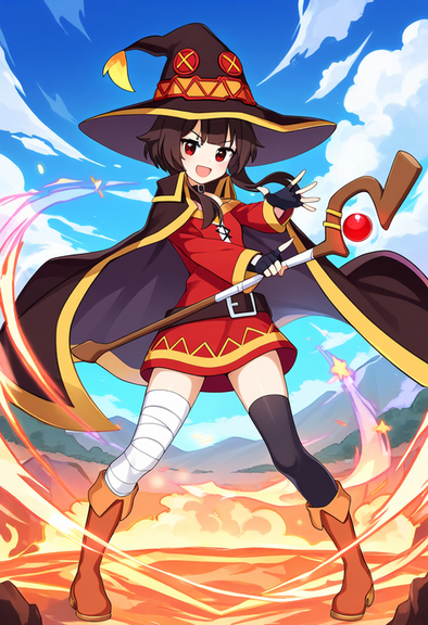 #blackgloves #brownhair #brownhairedgirl #cape #choker #fingerlessgloves #longsleeves #reddress #redeyedgirl #redeyes #shortdress #shorthair #shorthairedgirl #smallbreasts #witchhat #brownbelt #kneeboots #bluntbangs #sidelocks #meguminkonosuba #megumin_konosuba #bandagedleg #offshoulderdress #novelai #blackthighhigh #novel_ai #asymmetricallegwear