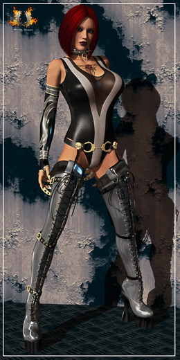 Love her leather/latex thigh-high long boots.Outfit is nice.Redhead and yellow greenish eyes makes her a knock-out, anytime.Β Β Β Β