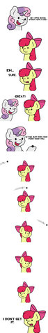 Well, not every pony is part food... Some seem to think Sweetie Belle is either a Dictionary or a robot. Heck, they think Scootaloo is a chicken and/or dodo.