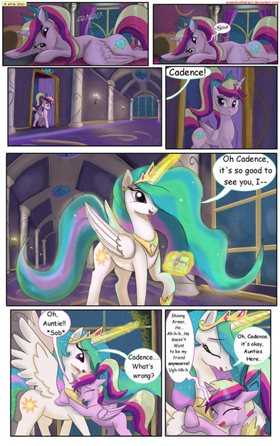 A very lovely comic. I like how Chrysalis cuts off Cadence before she says her nickname, which gives an explanation as to why Chrysalis seemed to insist on being called Mi Amore Cadenza rather than Cadence, since she never got Cadence's nickname, just her full name (my personal headcanon is that Cadence hates her full name, and very rarely uses it, unless perhaps for a formal introduction, so it's easy to see her completing the sentence Chrysalis cuts off with "but you can call me Cadence")