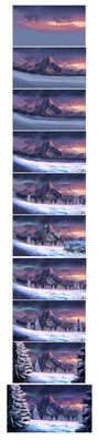 That is just so.. fantastic. Can't describe how this look. So real, I love the left tree, and the one you blured at the right. Also the mountains looks so realistic! Did you use any referense for this? If you didn't you got an amazing fantasy xD The northen lights and the stars is really good drawed <:
