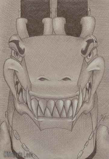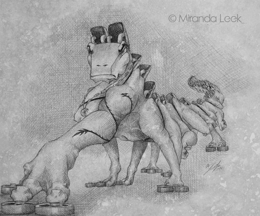 Their metal hide is organtic, an example of bio mechanical. It's still hard an impenetrable, but it's flexible like skin (this way the character can actually move and show emotion) Their hands and feet each have three fingers (one is a thumb) and on each end is a wheel that differs depending on if the coaster is wood or steel. The reason for three fingers and wheels is a reference to the three different types of wheels on a coaster - upstop, road, and guide.